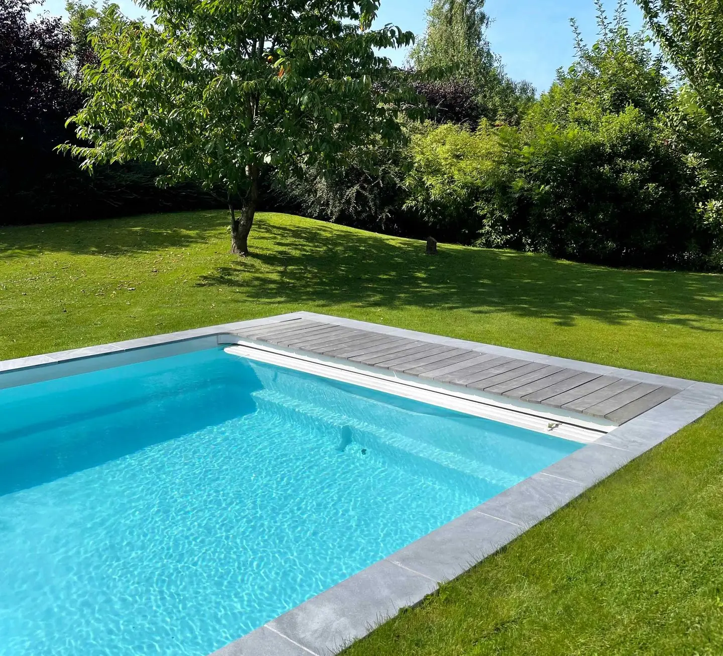 Des piscines premium allant de 3,90 m à 10,80 m de long, en fond plat ou pente composée avec un coffre immergé pour volet automatique.