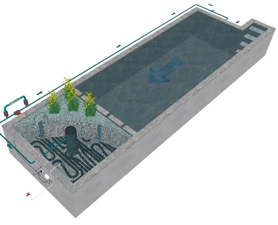 La pompe sera placée à l’intérieur ou y est reliée. Idéalement, l’entrée de la zone du lit de marais se trouve du côté nord-est de l’étang (ensuite, les vents dominants du sud-ouest aident les particules de saleté à s’y déposer). Toute la pollution reste dans le système et est traitée par la nature.