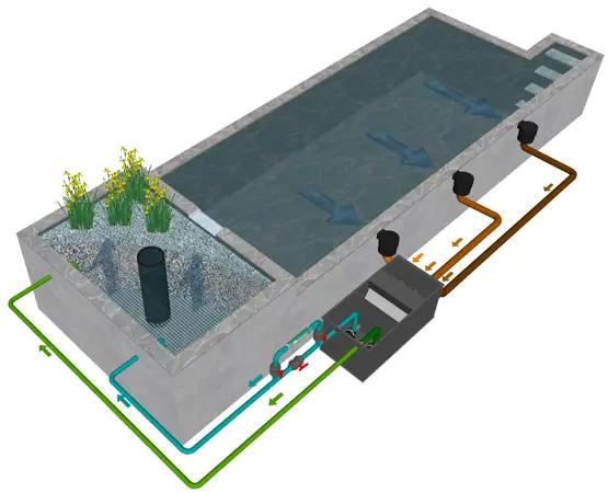 Là, un tamis courbé se charge de la filtration ultérieure. Une pompe dirige ensuite l’eau de bas en haut à travers une couche de substrat dans la zone de marais. Enfin, l’eau purifiée s’écoule entre les pas japonais (ou via des cascades) pour retourner dans la zone de baignade. Une partie de la pollution est éliminée mécaniquement du système, la nature fait le reste.