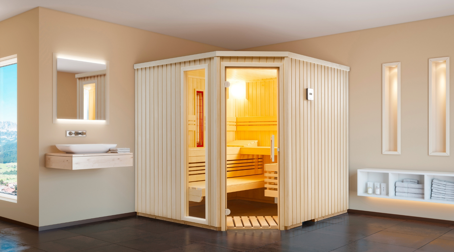Pour l’aménagement intérieur également, vous trouverez plusieurs variantes de design. Nous transformons volontiers votre sauna sur mesure en un ensemble énergétique multifonctionnel à technologie infrarouge intégrée et évaporateur à sel qui vous apportera un soutien spécifique en cas de problèmes de peau ou de voies respiratoires.